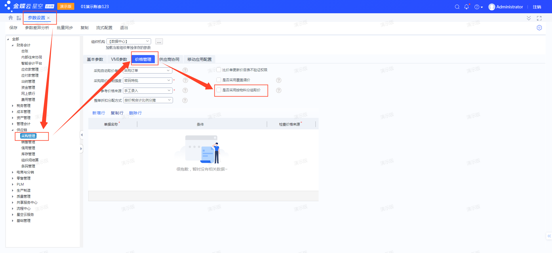 参数位置:基础管理>公共设置>参数设置>供应链>采购管理>价格参数>是否采用按物料分组取价